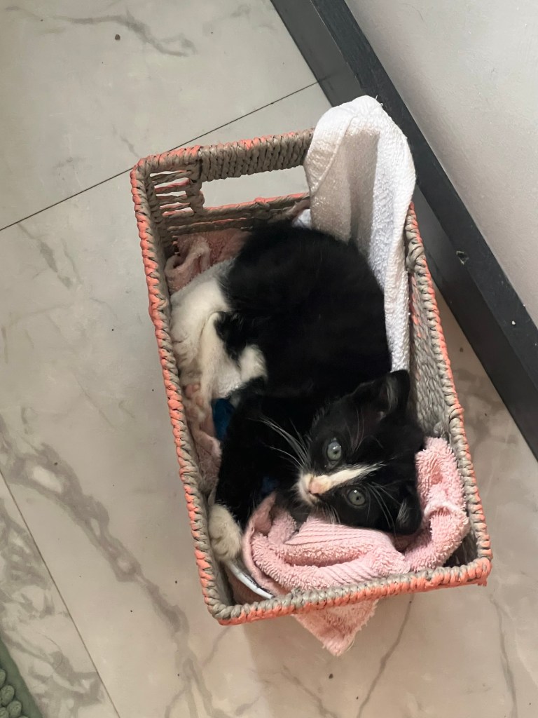 I arrived at work at 5:23 am, and my shift started at 5:30. I was walking through the parking lot and heard screams and cries, and I was like oh no, I know what that is. I’m getting closer and in the front under a truck, meowing his little heart out so tiny I could barely see him. It was dark out. I tried to get him, but he was scared, so I went inside to get a box or something and got help from a friend and fellow cat lover. All the people who had already walked by ignored him as if he was nothing. Well, I couldn’t do it. There was no way I could work with his cries in my head, knowing he was alone, hungry, and scared. So we went outside with our box, and we got him. That’s when I saw how tiny he was, maybe three weeks old. I left work, took him home, put him in the bathroom for the day, and returned to work. Then, back at work, everyone said, “That’s so good of you. I’m thinking, for what? Doing the right thing. They said one man had him in his van from home and couldn’t get him, so he rode to work in the engine, survived, and hopped out. He was asking for help, and everyone walked on by and ignored that baby. I came home, bathed, cleaned, and started bottle-feeding him, and he was very content.
